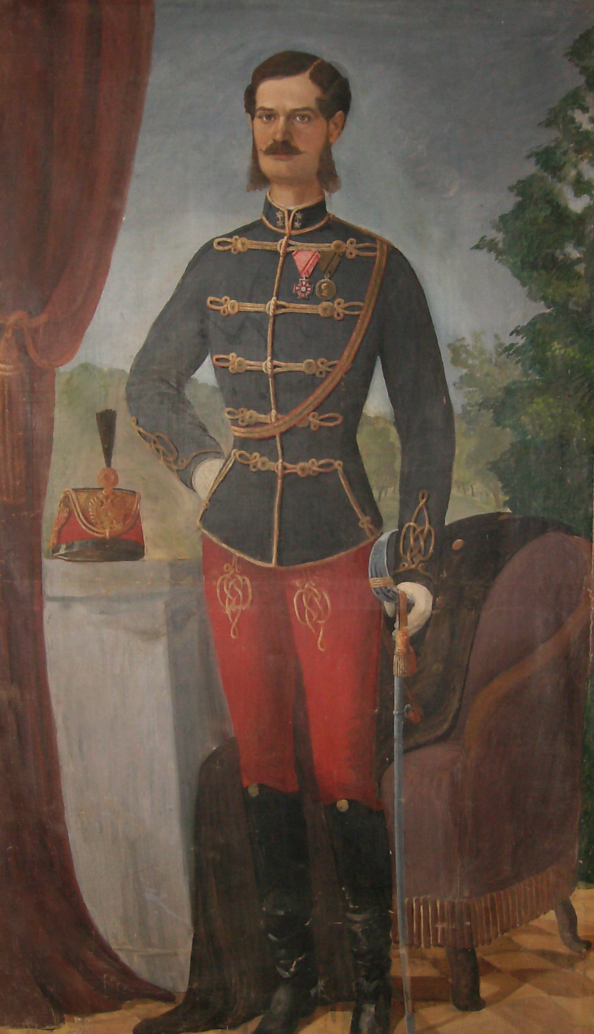Na portretu je prikazan mlađi muškarac u stojećem stavu sa desnom rukom oslonjenom na kuk dok levom pridržava sablju koja se pruža do poda. Obučen je u austrijsku oficirsku, konjičku uniformu, u plavom mundiru i crvenim pantalonama, obuven u crne čizme. Na levoj strani njegovoh grudi prikazane su dve medalje, jedna u obliku krsta kombinacije crvene i sive boje, a druga sa predstavom desnog profila, najverovatnije Franc Jozefa. Iza portretisanog prikazana je fotelja braon boje preko koje je prebačen kaput, najverovatnije šinjel, tamno braon boje sa zlatnim dugmadima, a pored fotelje deo balkonske ograde na kome je smeštena oficirska kapa sa grbom monarhije. Sa leve strane platna veliku površinu zauzima prikaz draperije braon boje koja je skupljena učkurom na središnjem delu slike. U pozadini je prikaz otvorenog prostora, pejzaža.